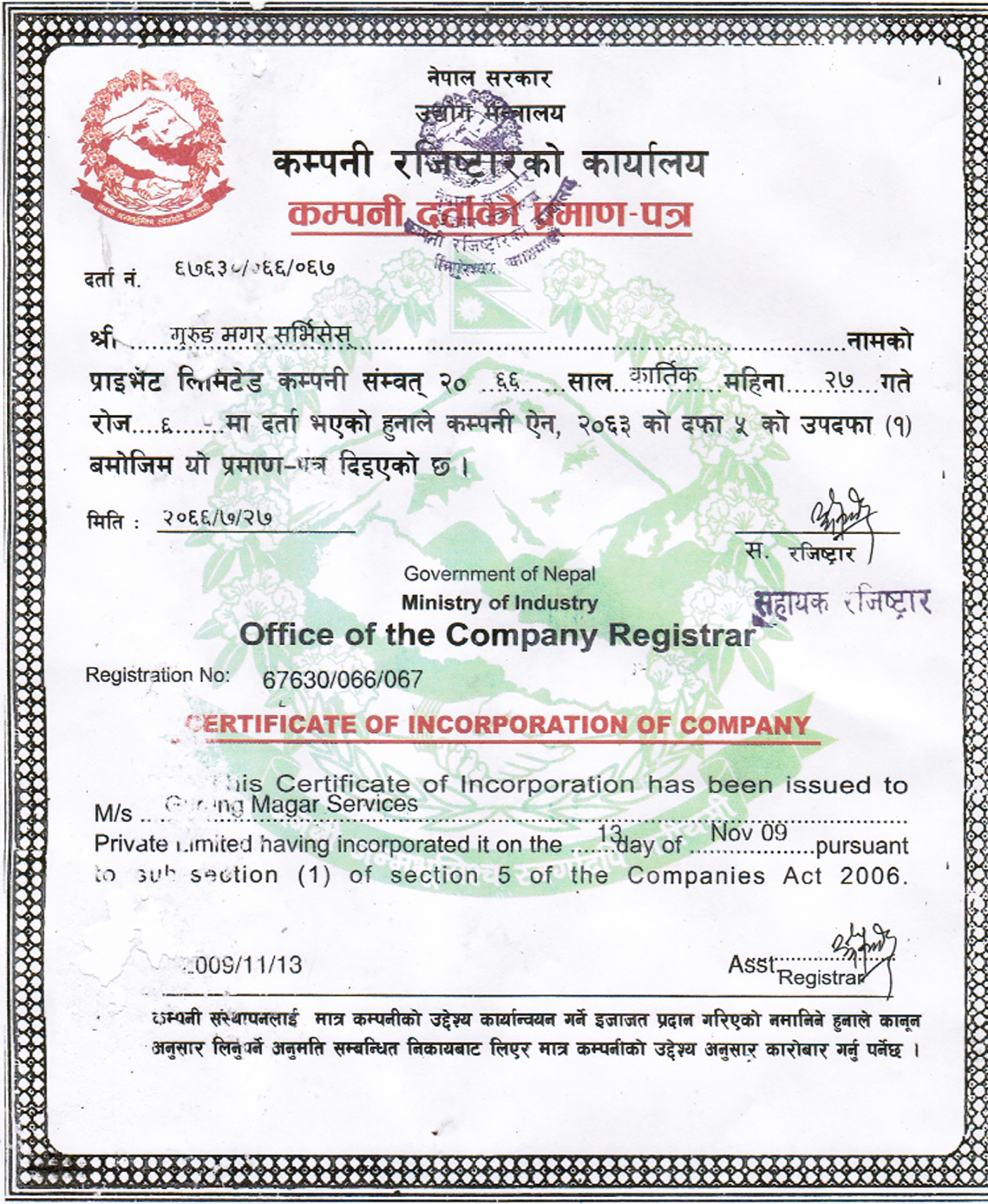 Company Registration Certificate of Gurung Magar Services Pvt. Ltd.