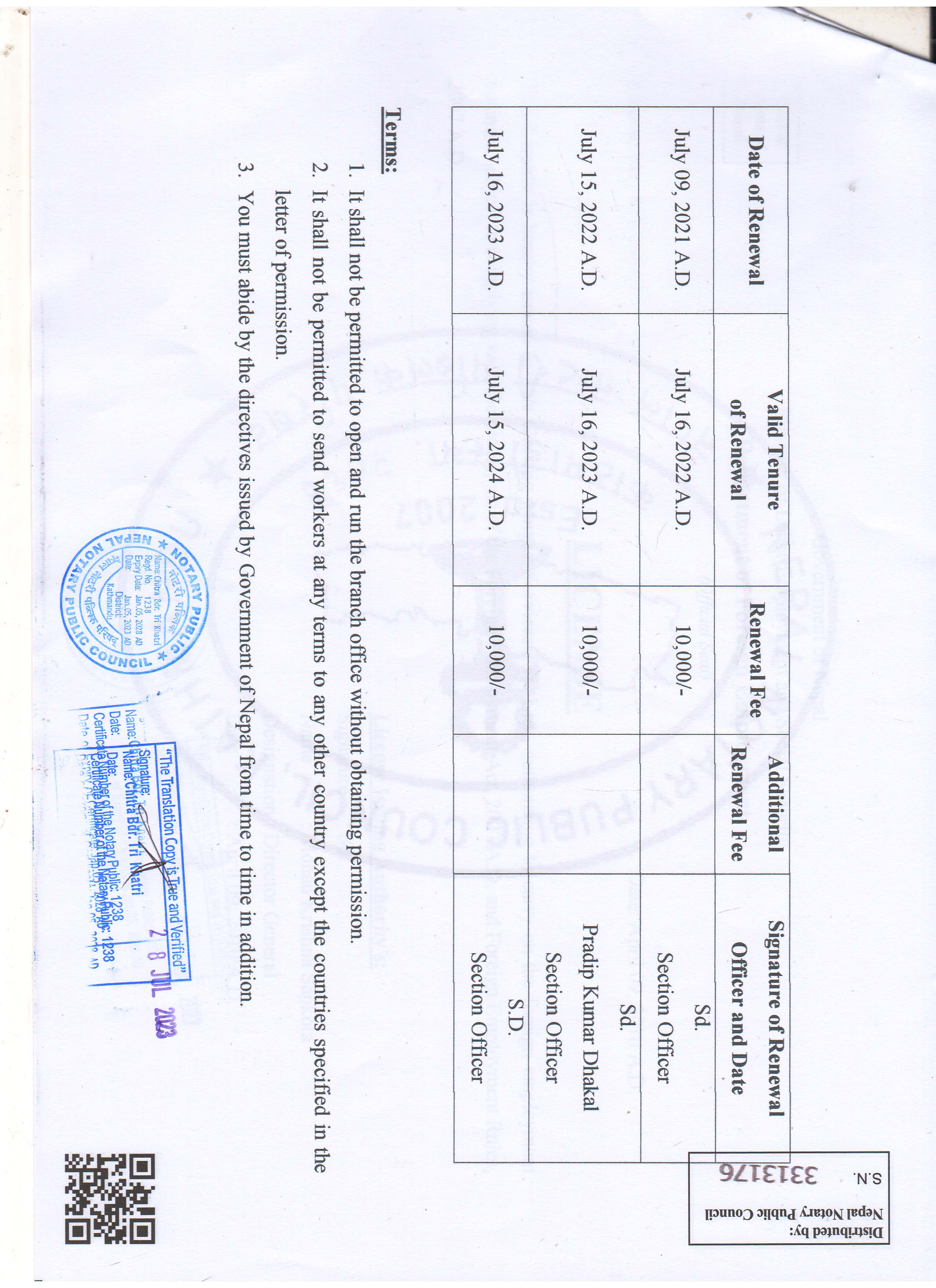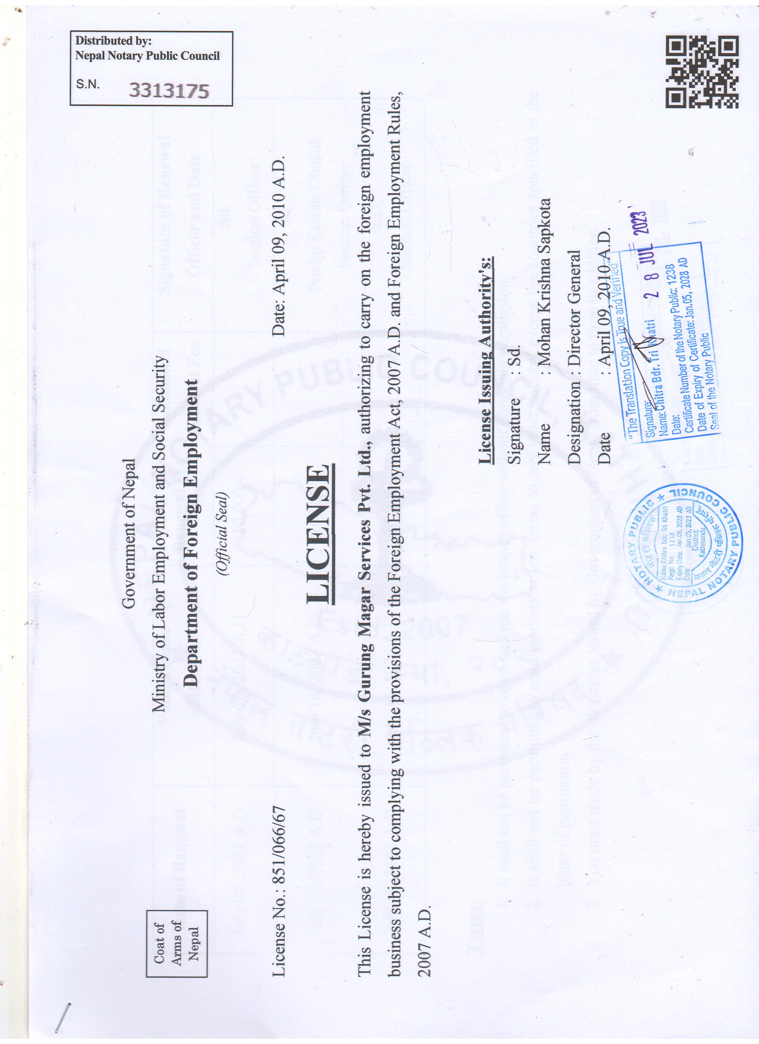 Notary of Licence's Front Side of Gurung Magar Services Pvt. Ltd.