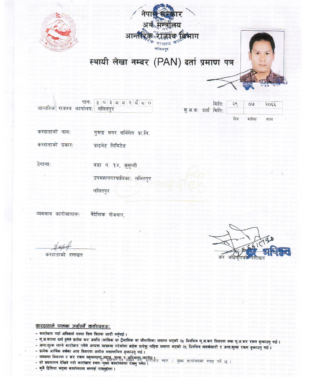 Personal Account Number (PAN) Certificate of Gurung Magar Services Pvt. Ltd.