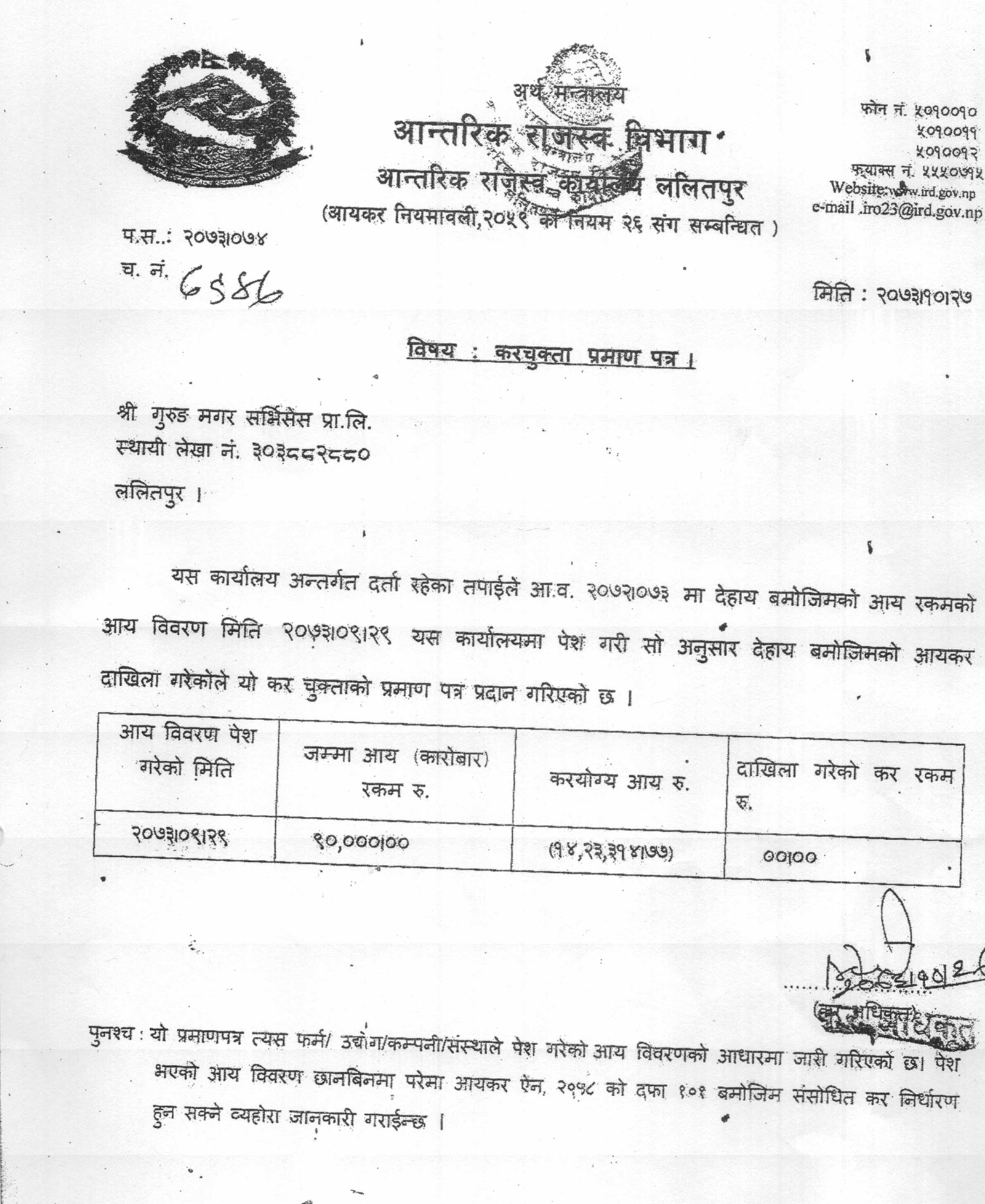 Tax Clearance Certificate of Gurung Magar Services Pvt. Ltd.